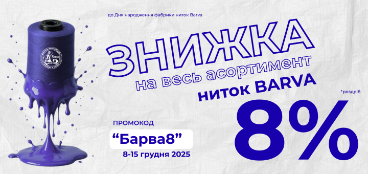 Без рубрики / Головні новини / Новинки та акції 04.12.2025 8% на всі нитки Barva Українській фабриці ниток “Barva” сьогодні виповнюється 8 років! На честь цієї події традиційно даруємо знижку на ВСІ нитки Barva в асортименті