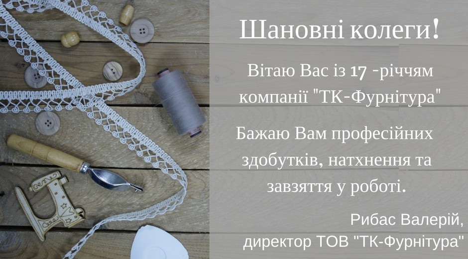 Прийміть привітання з 17-річчям компанії ТК-Фурнітура! 14.11.2016 Привітання з днем народження компанії ТК-Фурнітура! Сохранить Поділитися: